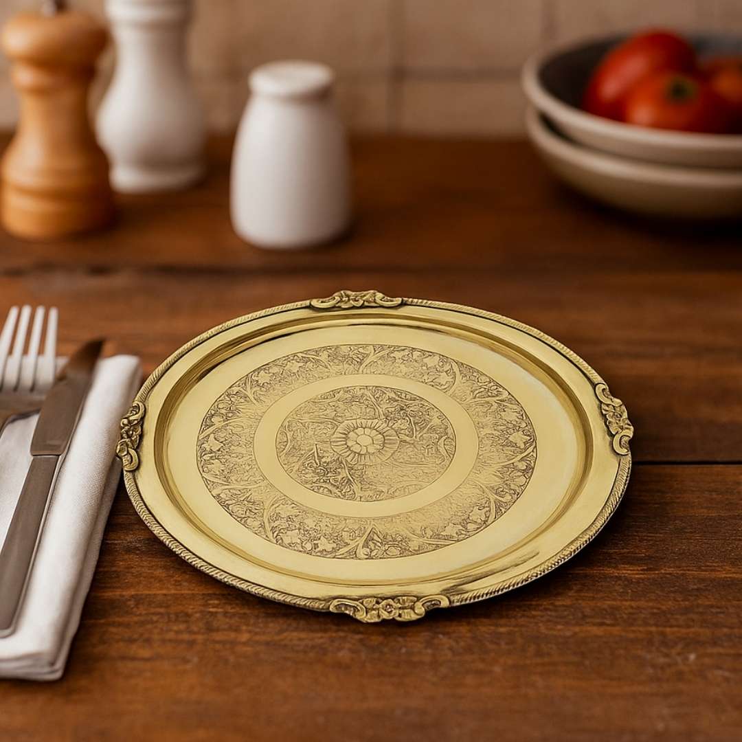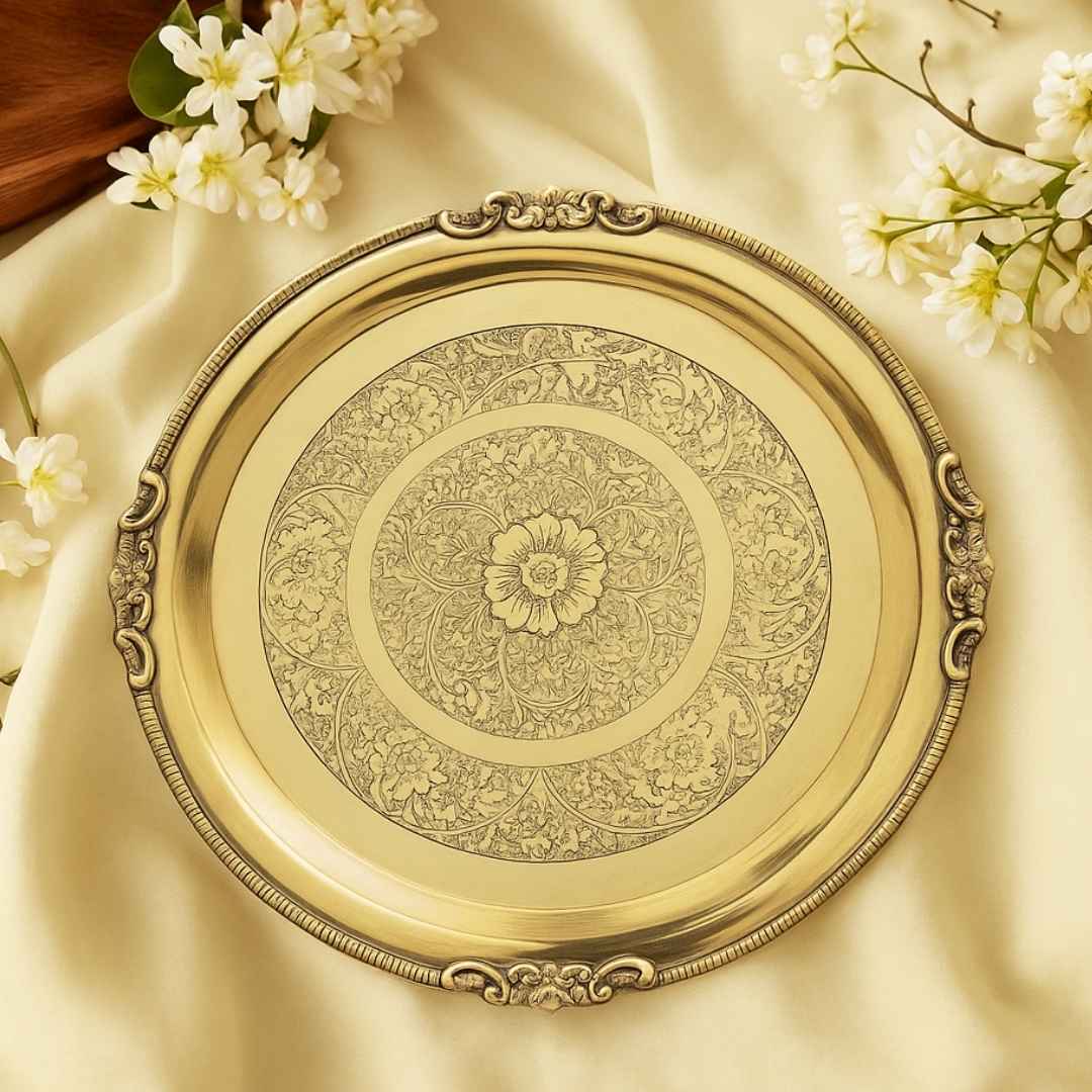Made from 100% pure brass, this thali has intricate carvings, which not only enhance its beauty but also reflect the rich cultural heritage of India. Whether for daily use or for gifting during festivals, puja or for serving to someone, this brass thali makes every meal special.