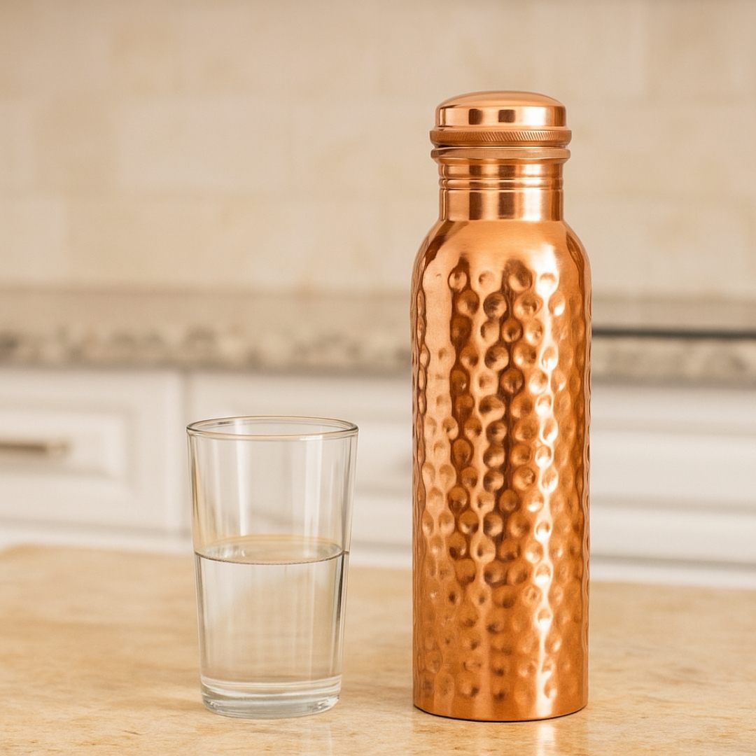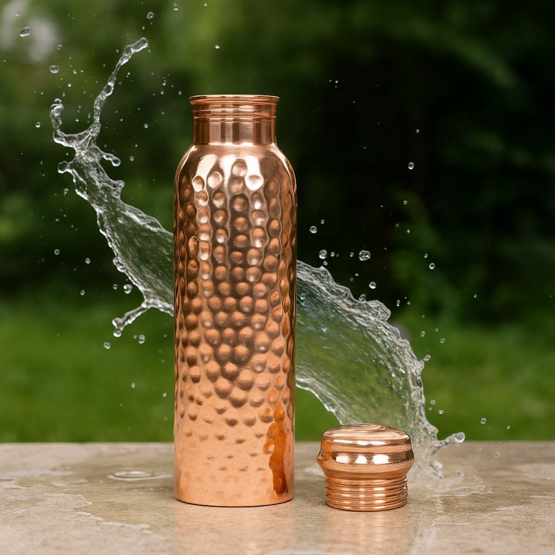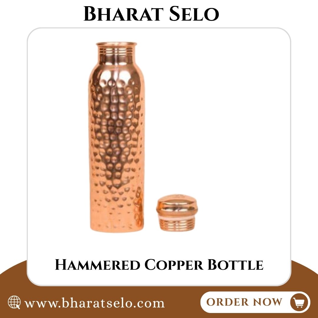 Hammered Copper Bottle manufactured by Bharat Selo. Designed with a premium hammered finish, this bottle adds a traditional yet stylish charm to your lifestyle. Made from 100% pure copper, it’s more than just a copper water bottle — it’s a tool for natural healing and daily detox.